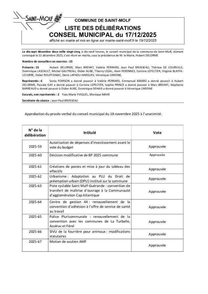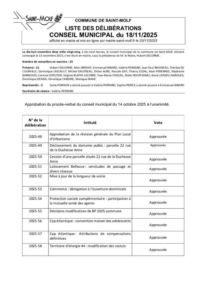 Cette rubrique est en cours de refonte. La commune bascule progressivement vers la solution « open data » développée par la direction informatique de la communauté d’agglomération Cap Atlantique, qui permettra de consulter à terme toutes les délibérations.